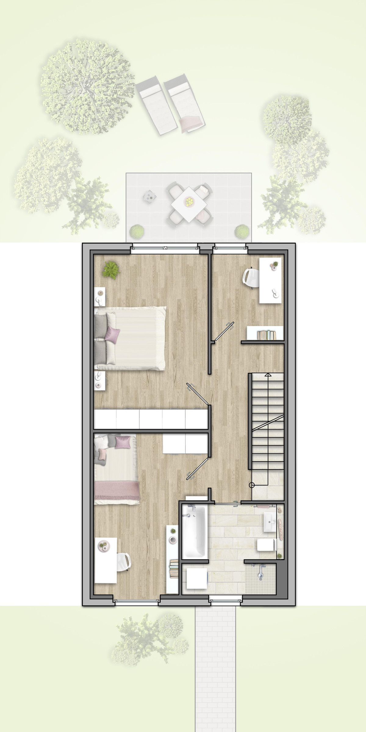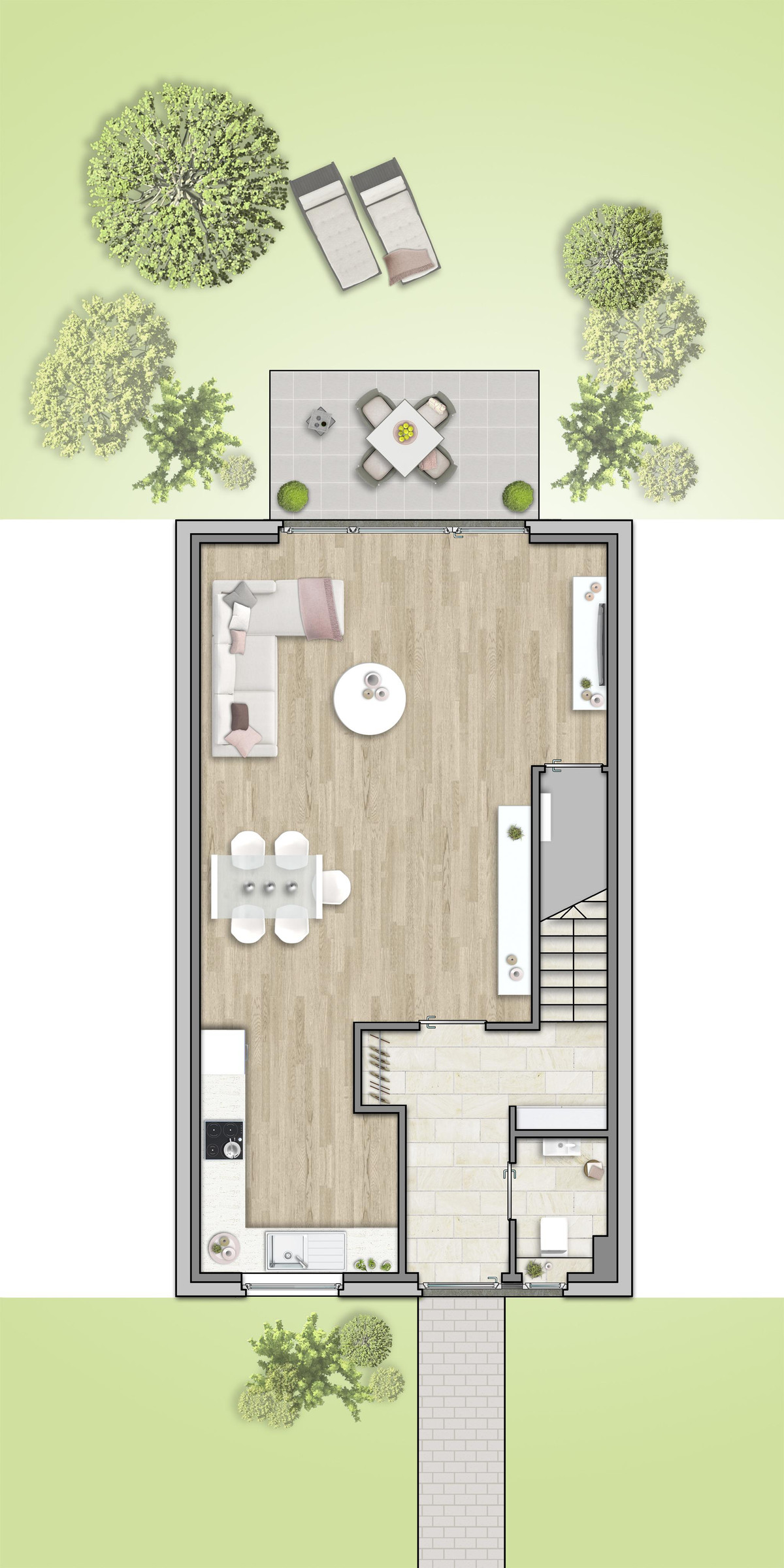 Smart and secure. You can save even more energy in your new home using the smart home system: it controls, for example, the underfloor heating and helps reduce consumption. Safety is also important in VISTA homes: all windows are equipped with shutters (except in the guest WC). Ground-floor windows are lockable and have additional burglary protection. Indoor safety: the staircase is closed and straight, allowing young and old to move safely through the house.