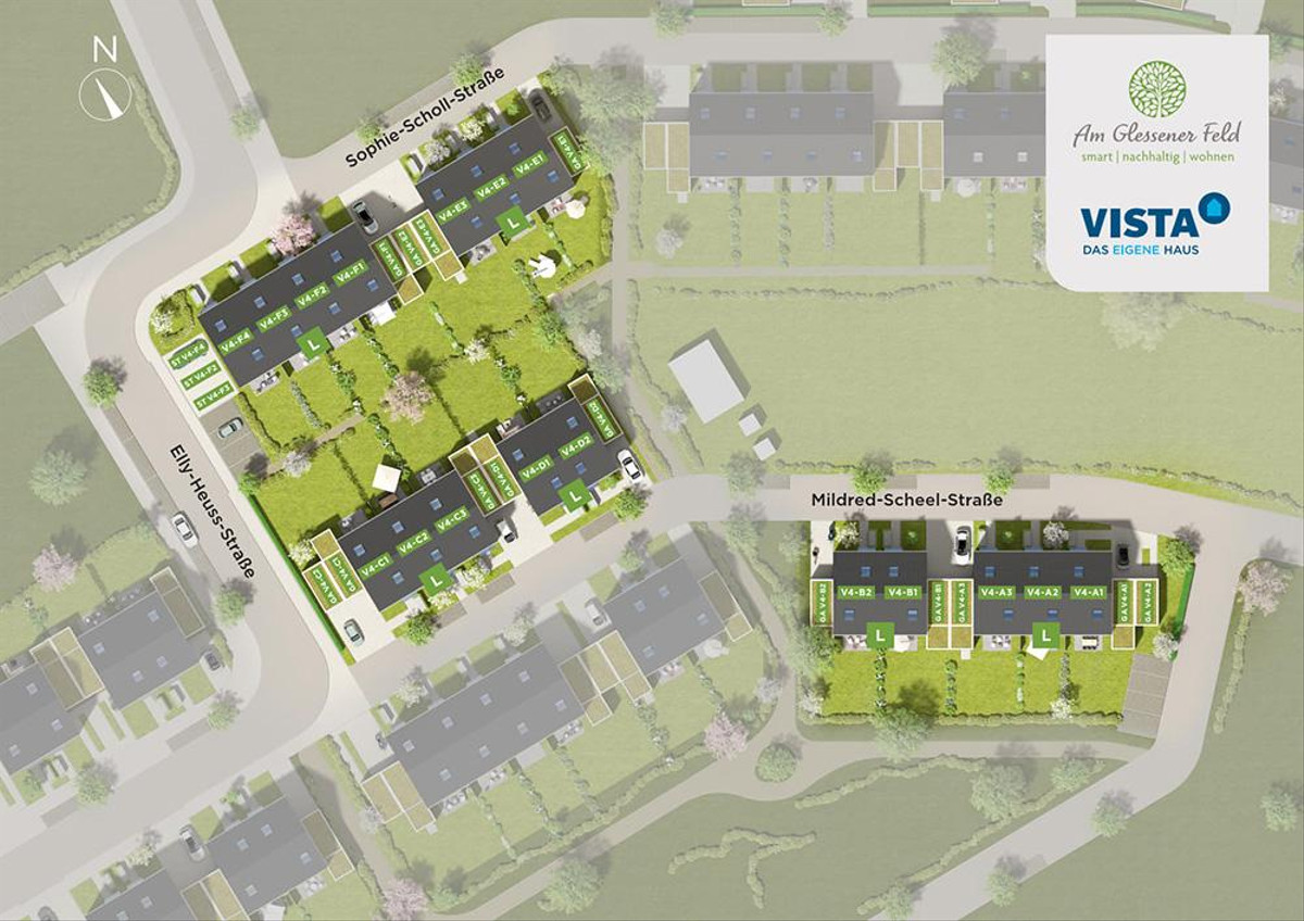 Use energy efficiently. All houses feature energy-efficient construction. Heating energy is generated via district-specific central units using heat pumps. This ensures greater independence from fossil fuels. Each house is also pre-equipped with a conduit for the later installation of a photovoltaic system.