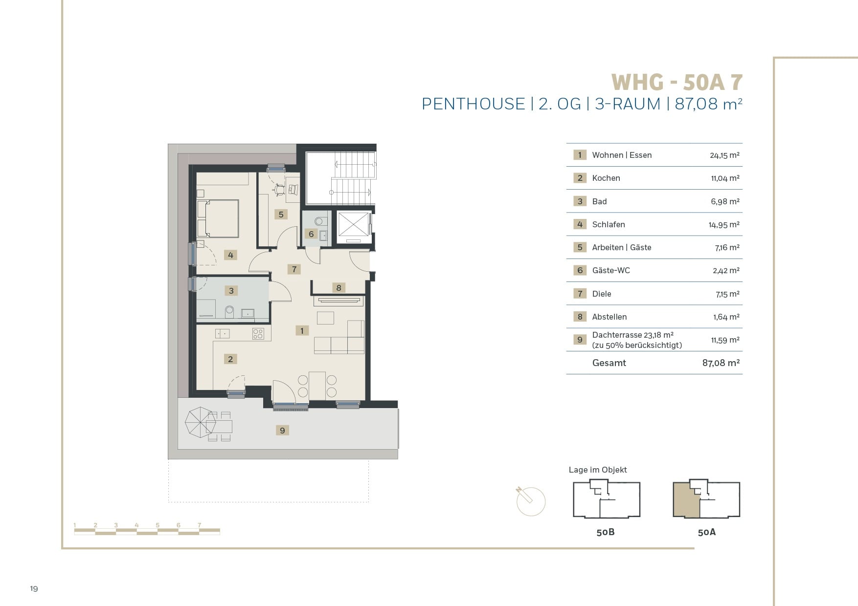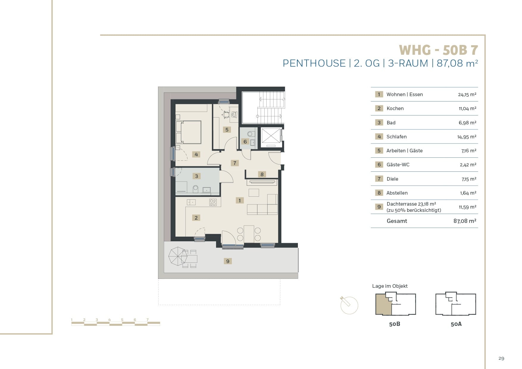 - Ca. 2,45 bis 2,50 m lichte Deckenhöhe in den Wohnungen, Penthäuser mit bis zu 2,80 m Deckenhöhe