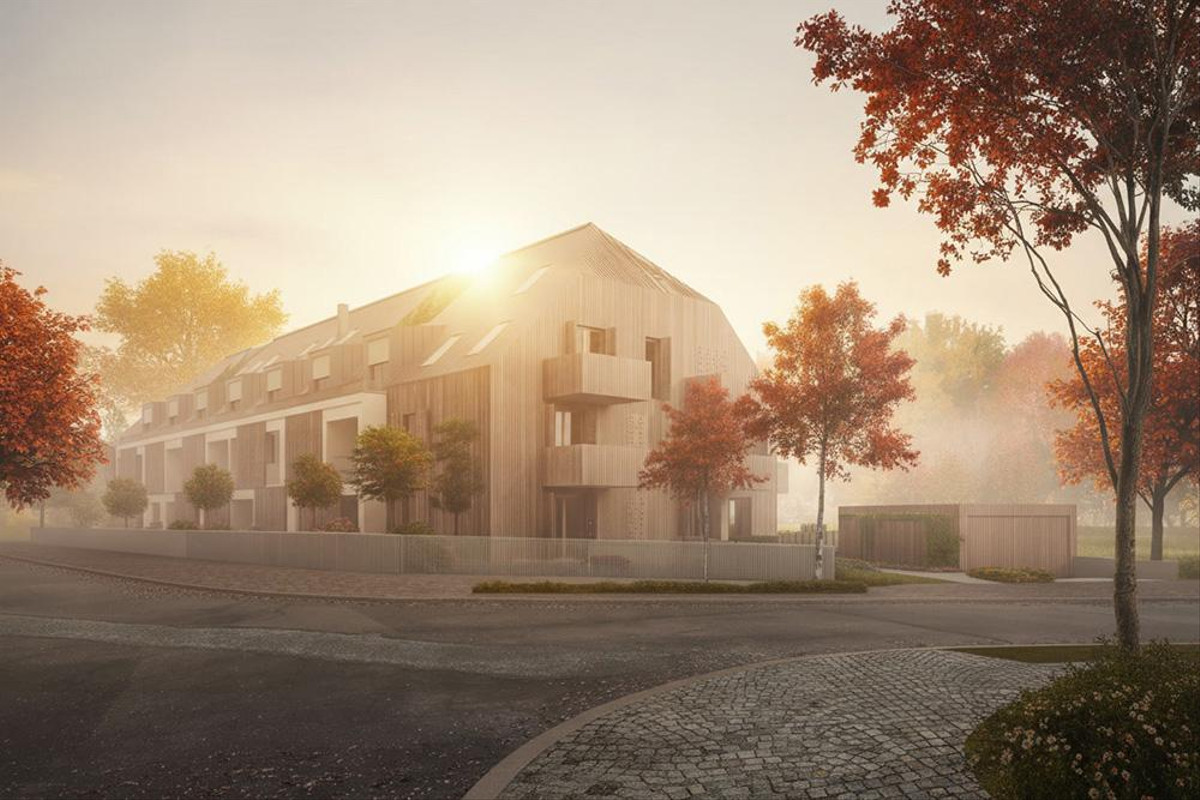... and cozier is DAS KLEINOD through its special architecture. It was inspired by communal life on a farm. True to farm life, many special details on house and yard have emerged that make the building unique. Spectacular roof terraces with wooden beams, a cozy wooden facade, healthy real flower wallpaper, and a beautiful entrance characterize the building. In the garden we have created a fire pit with outdoor kitchen for communal life, a horse playground for the youngest, and raised beds for young and old. Buying fruit will soon be superfluous, because the many fruit trees and berry bushes offer enough for every resident.