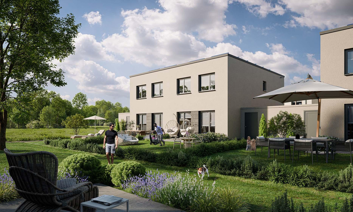 Ob Reihenhaus oder Doppelhaus – jedes Haus bietet vier Zimmer, einen offenen Wohnbereich und viel Raum für Familienleben. Die Dachstudios lassen sich vielseitig nutzen, Terrassen und Gärten sind nach Süden ausgerichtet. Dazu kommt eine eigene Garage mit Stromanschluss – direkt am Haus.