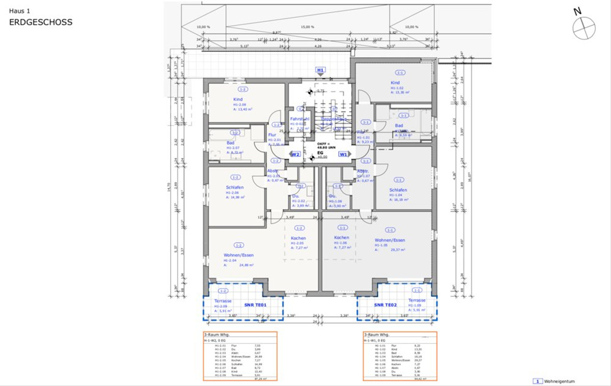 Residential building 1 comprises 5 units from 87 sqm to 134 sqm on 3 floors.