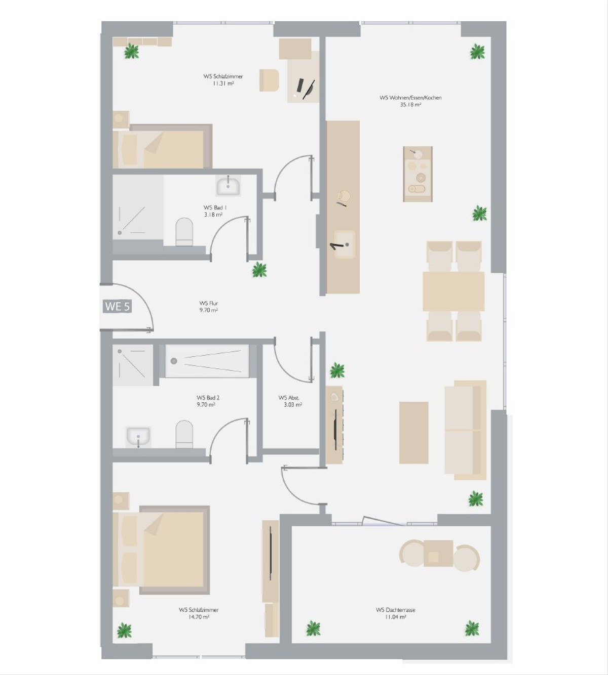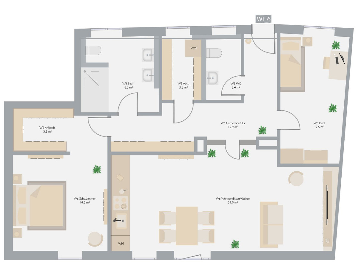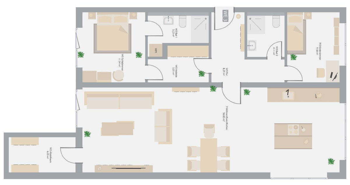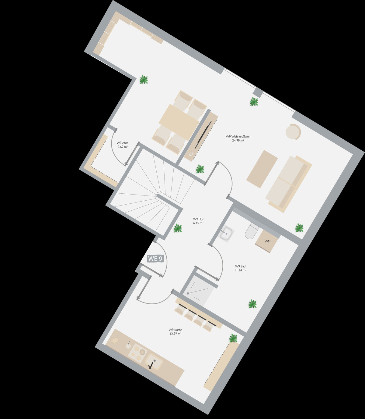 - 5 apartments on the ground floor, each with 2 to 3 rooms as well as a garden and separate storage room