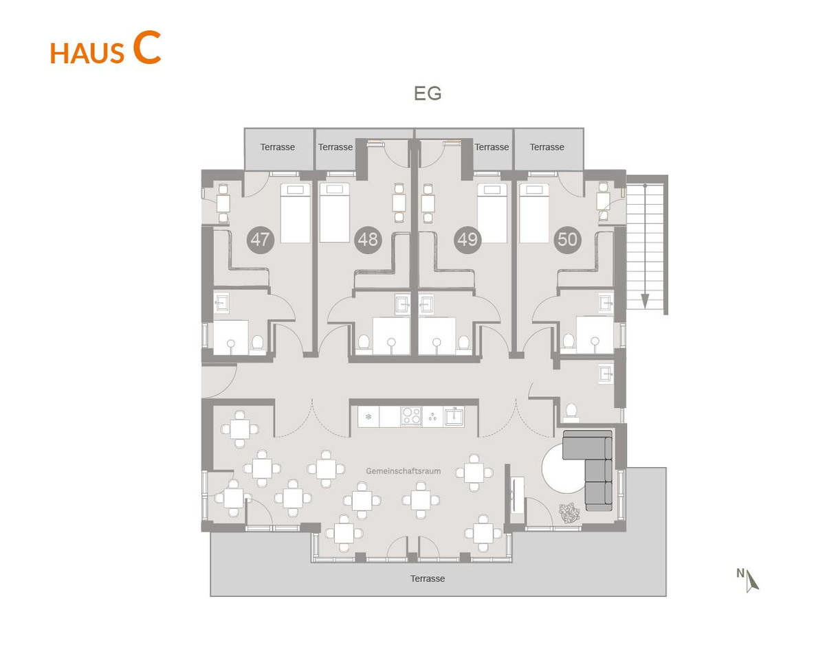 In addition to the private studios, the project offers attractive communal areas: a fitness room in the basement, a stylish community lounge (in house C) with access to the furnished terrace as well as a practical laundry room are available to all residents. For additional storage space, each studio receives its own locker cabinet in the basement.