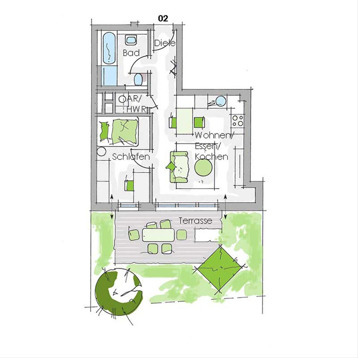 Die Freisitze der Wohnungen zeigen nach Süd-Ost: Wenn Sie auf Ihrem großzügigen Balkon oder auf Ihrer Terrasse sitzen, werden Sie einen herrlichen Blick ins Grüne genießen können.