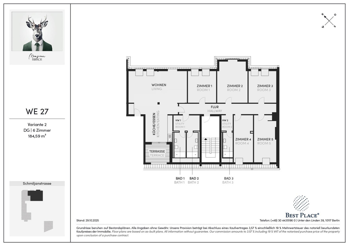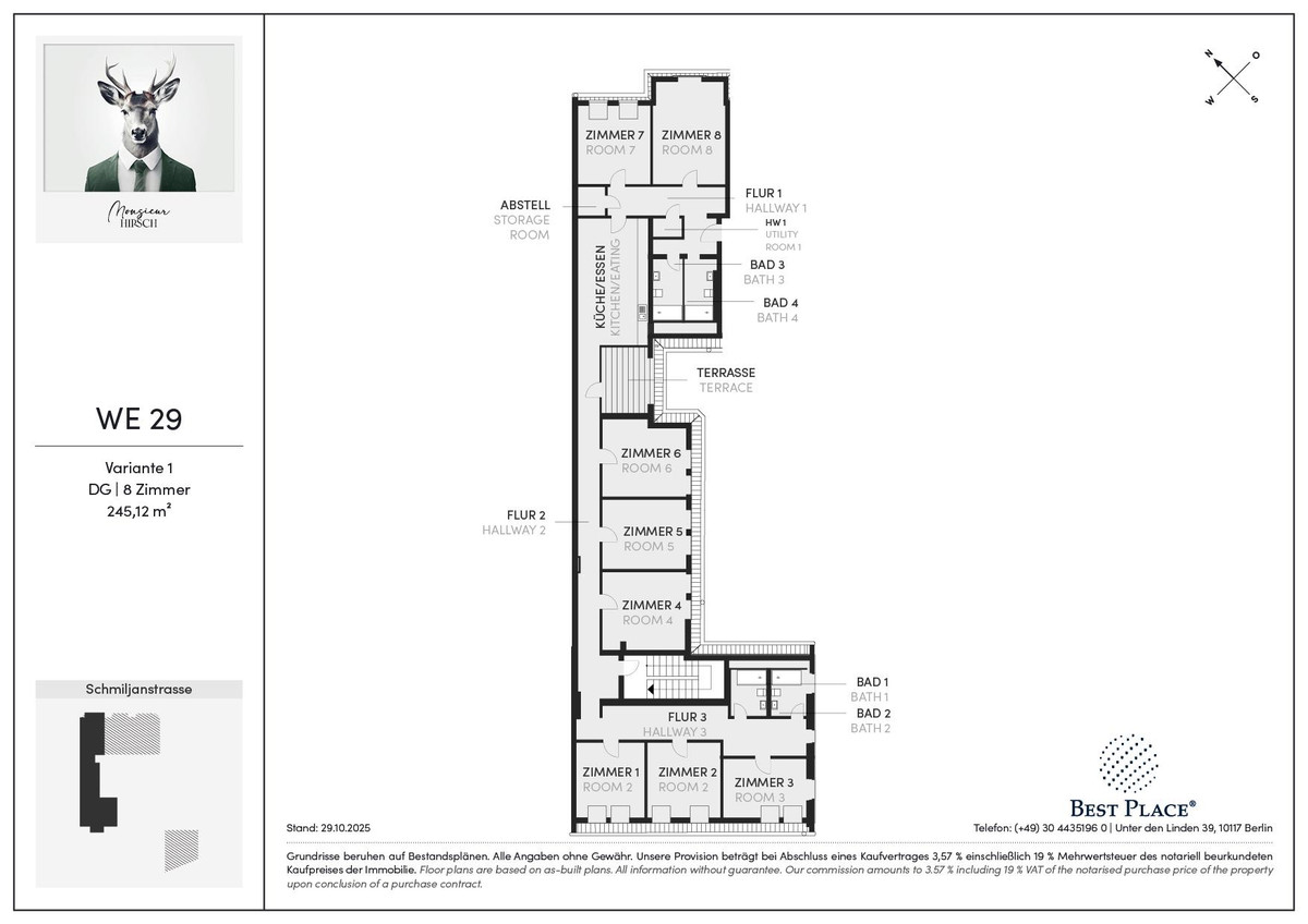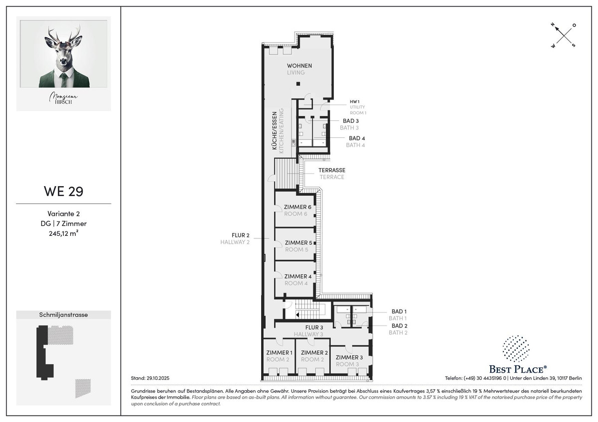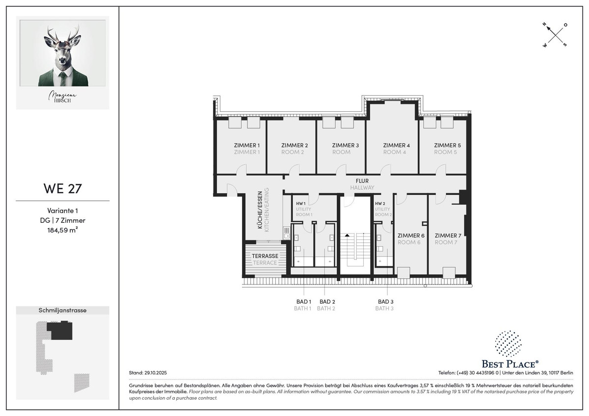 Monsieur Hirsch ist ein elegantes Gründerzeit-Ensemble mit Baujahr 1900. Es liegt im schönen und idyllischen Friedenau im Bezirk Tempelhof-Schönberg, der zwei Hirsche in seinem Wappen führt. Die in Braun und Grün gehaltene Klinkerfassade erinnert außerdem an die Bewohner des Waldes, der mit dem Grunewald ganz in der Nähe liegt. Das viergeschossige Ensemble umfasst ein Vorderhaus, einen Seitenflügel, ein Hinterhaus sowie eine Remise im Innenhof. Auf insgesamt vier Etagen befinden sich 26 Wohnungen aus der Gründerzeit. Helle Tageslichtbäder und Balkone gewährleisten hohen Wohnkomfort und eine attraktive Vermietbarkeit. Auf das Gründerzeitgebäude wurde ein Neubau-Dachgeschoss aufgesetzt, in dem zwei Neubau-Wohnungen entstanden sind. Zudem wurde die historische straßenseitige Fassade aufgearbeitet, die Dämmung der hofseitigen Fassade erneuert und die Treppenhäuser wurden renoviert.