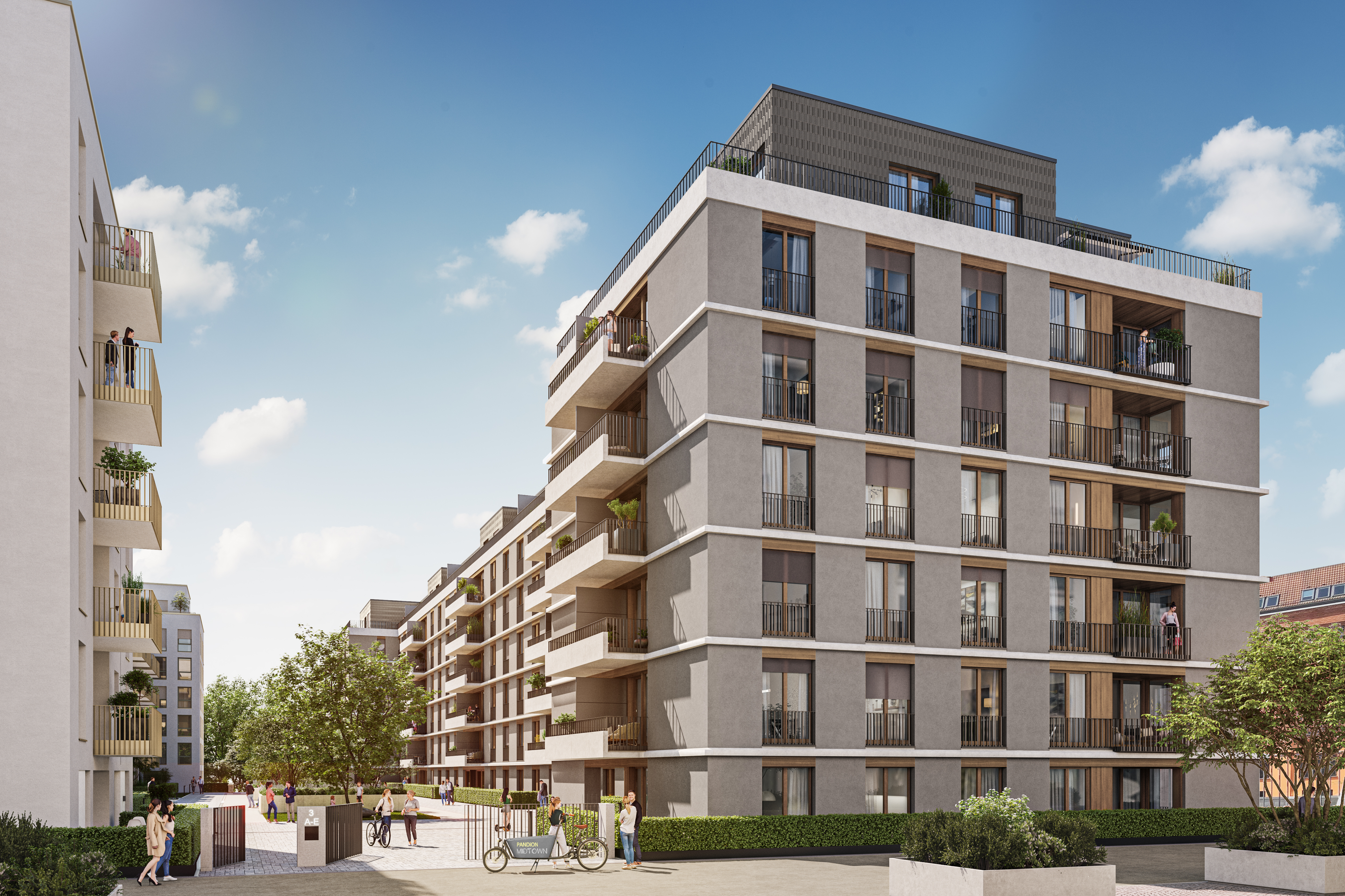 First prize for Zanderroth Architects: the design for PANDION MIDTOWN 4 was selected in a competition. What was crucial for the jury was “the successful synthesis between a very strict facade and a good rhythm that divides the building to scale”. Between the historic buildings, vaults and new houses of the first three construction phases, Zanderroth is creating a block of five elegant and well-proportioned urban houses. Its powerful, concise structure sets clear standards: merged balconies above the house entrances ensure the urban planning desired and identity-creating breaks in the façade. What is also striking is the access to the apartments from the green courtyard plateau. The staggered floor is also a world of its own: you live in small houses in the countryside high above the city. View and brewery – these are the architectural motifs that ultimately determine a high quality of life.