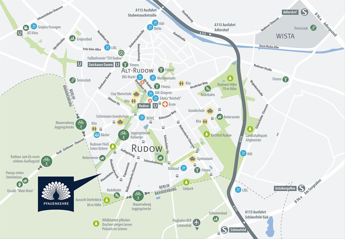 Egal was Sie suchen, vom Ponny reiten über Fahrradtouren nach Brandenburg oder dem Joggen entlang dem Rudower Fließ, hier werden Sie fündig werden. Lassen Sie sich auch nicht den Ausblick von der Rudower Höhe oder dem nahe gelegenen Dörferblick entgehen! Das reichhaltige Angebot an Kinderbetreuung, Schulen, Ärzten und Sportvereinen macht Rudow zu einer besonders beliebten Umgebung für Familien. Das Grundstück liegt westlich vom Rhodeländerweg, das über die Buslinie 271 direkt an den U-Bahnhof Rudow angebunden ist. Die U7 bietet eine schnelle Anbindung an die Ringbahn S41/42, mit der wiederum alle Bezirke Berlin schnell und bequem erreicht werden können. Durch die Lage der A113 entsteht eine hervorrangende Anbindung zur Innenstadt und dem äußeren Autobahnring.