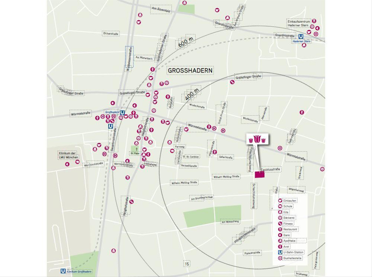 Von Ihrer neuen Wohnung aus sind es nur wenige Gehminuten bis ins Herz von Großhadern. Hier finden Sie alles, was man sich für eine optimale Versorgung nur wünschen kann. Vom eigenen Klinikum über zahlreiche Arztpraxen bis hin zu Banken, Restaurants und gemütlichen Cafés. Auch die Bushaltestelle ist nur 200 Meter entfernt – praktisch, unkompliziert, nah.