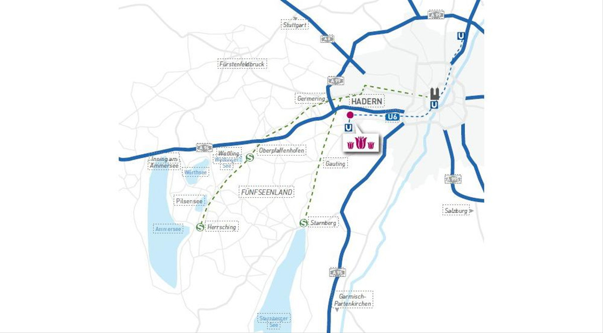 Großhadern liegt am südwestlichen Stadtrand der Landeshauptstadt und ist über den Mittleren Ring mit dem Auto nur wenige Fahrminuten von allen Highlights der Münchner Innenstadt entfernt.