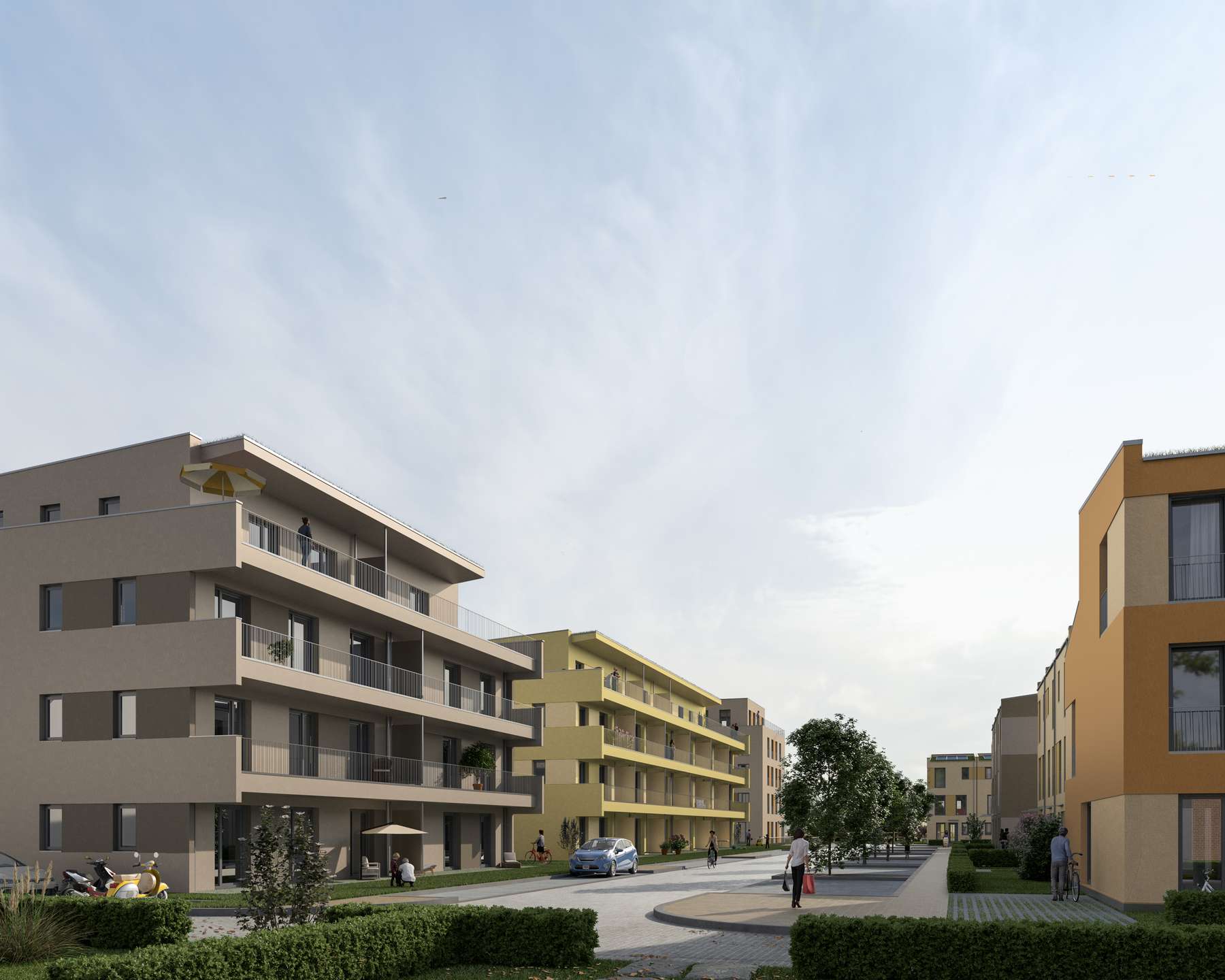 Between meadows and fields, 37 terraced houses and 8 semi-detached houses are being built in prefabricated timber construction, as well as two apartment buildings with green roofs and a total of 30 apartments, which will make sustainable dream homes come true for every requirement. The mixed, lively district offers a wide range of different residential options between around 49 and 140m². A commercial building with underground parking for office use with a total area of 3,000 square meters complements the neighborhood.