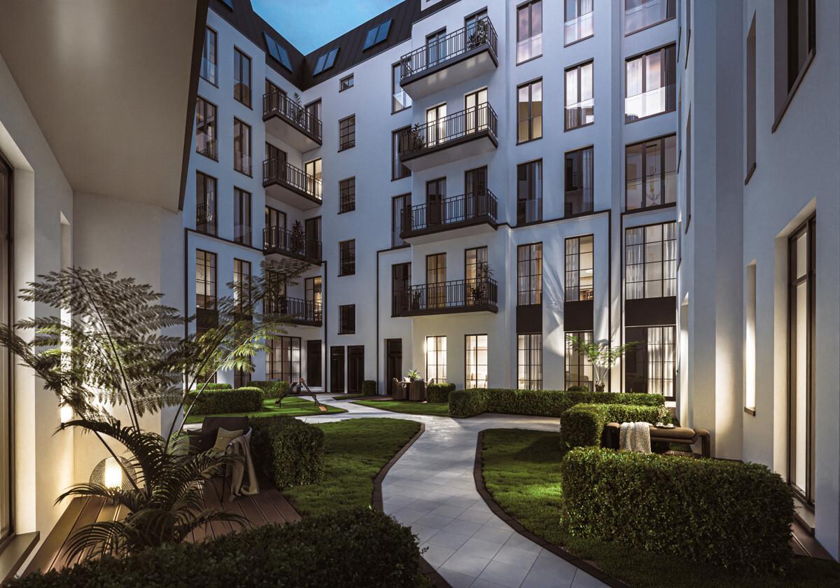 The striking corner building with its elegant windows, parapets and details consists of a front building along Simplonstrasse with two staircases and a front building along Dirschauer Strasse with one staircase. The elevators are also located in these 3 stairwells. At the rear, two side wings enclose the communal courtyard. The landscaped complex is a green oasis and completes the perfect architecture. Townhouses, studios, spacious apartments and penthouses guarantee first-class residential comfort. The best of two worlds combines here: the spaciousness of the Wilhelminian era and the comfort of a new building with exclusive interior design. All apartments have either a balcony or a balcony and a loggia. The penthouses have roof terraces with a 360° view over the capital. Underfloor heating, real wood parquet, stucco decorations and modern building technology give you excellent comfort. This also includes windows with integrated sun protection blinds and the bell and video intercom system. All bathrooms receive hand-picked premium amenities.