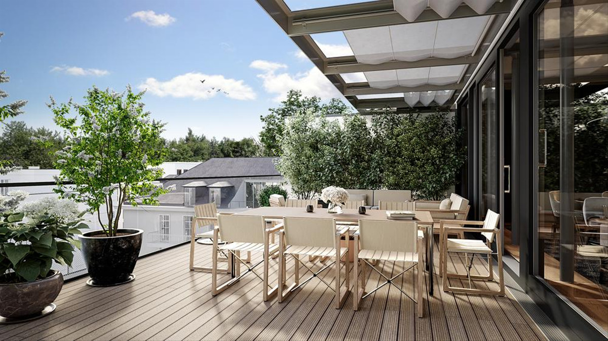 The Sophienterrassen in Harvestehude are in good company. The white villas, the established clubs, restaurants and cafés, the sailing and rowing boats and the Alster steamer are typical of life on and on the Outer Alster. On the extensive Sophienterrassen park area between Mittelweg and Harvestehuder Weg, the SOPHIENPALAIS forms the heart of the district. Here the town penthouse is located behind listed walls on the 3rd and 4th floors. With a southerly orientation and views over the Sophienterrassen and the Alster to the city of Hamburg. The spacious roof terrace and balcony extend the living space outside and put any garden in the shade.