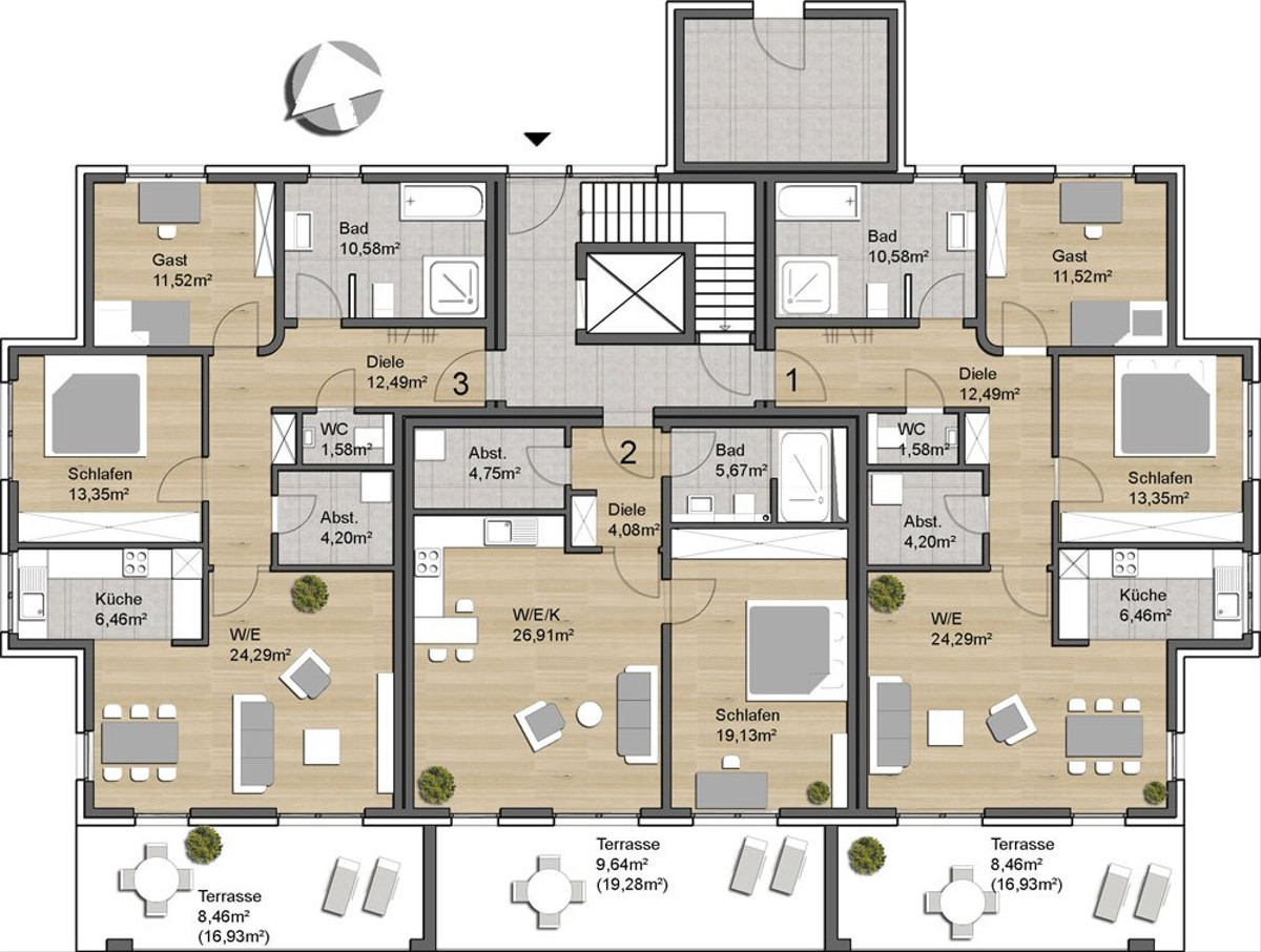 Das KfW 55 Effizienzhaus setzt neuste Technik voraus und bietet Neueigentümern einen Tilgungszuschuss und ein zinsgünstiges Darlehen der KfW. Die Wohnungen bieten attraktive und äußerst komfortable Grundrisse, die u.a. auch ein seniorengerechtes Wohnen ermöglichen. Die Wohnflächen von etwa 70 m² bis zu 103 m² verteilen sich auf zwei bis drei Zimmer mit ansprechender Aufteilung. Je nach Lage verfügen die Wohnungen über Terrassen mit Gartenanteil, große Balkone oder weitläufige Dachterrassen.