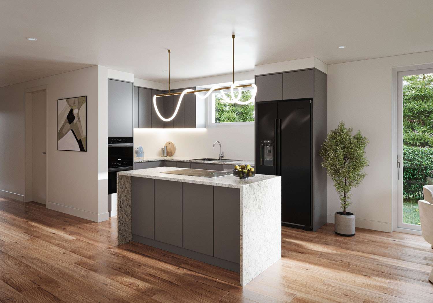 Die Küchenplanung ist bereits auf eine moderne Kochinsel ausgelegt und bietet damit den idealen Mittelpunkt für gemeinsames Kochen, Gespräche und Familienleben. Darüber hinaus ist das Haus für Smart-Home-Lösungen vorbereitet, sodass Beleuchtung, Beschattung oder Heizung auf Wunsch komfortabel digital gesteuert werden können.