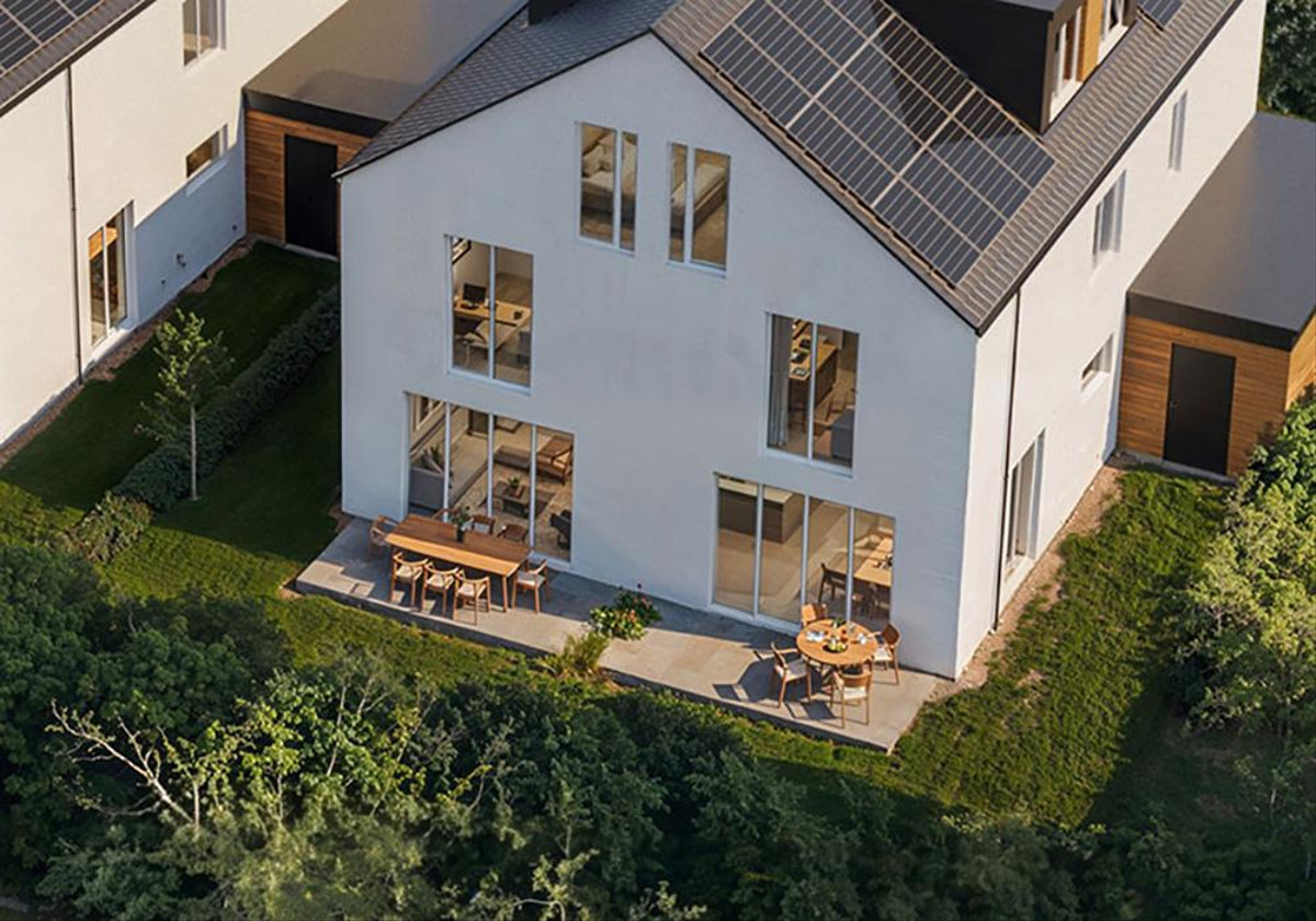 Eine umweltfreundliche Luft-Wärmepumpe sorgt für wohlige Wärme, die Photovoltaikanlage produziert Sonnenstrom direkt vom Dach, und durch die dreifach verglasten Fenster bleibt die Kälte draußen.