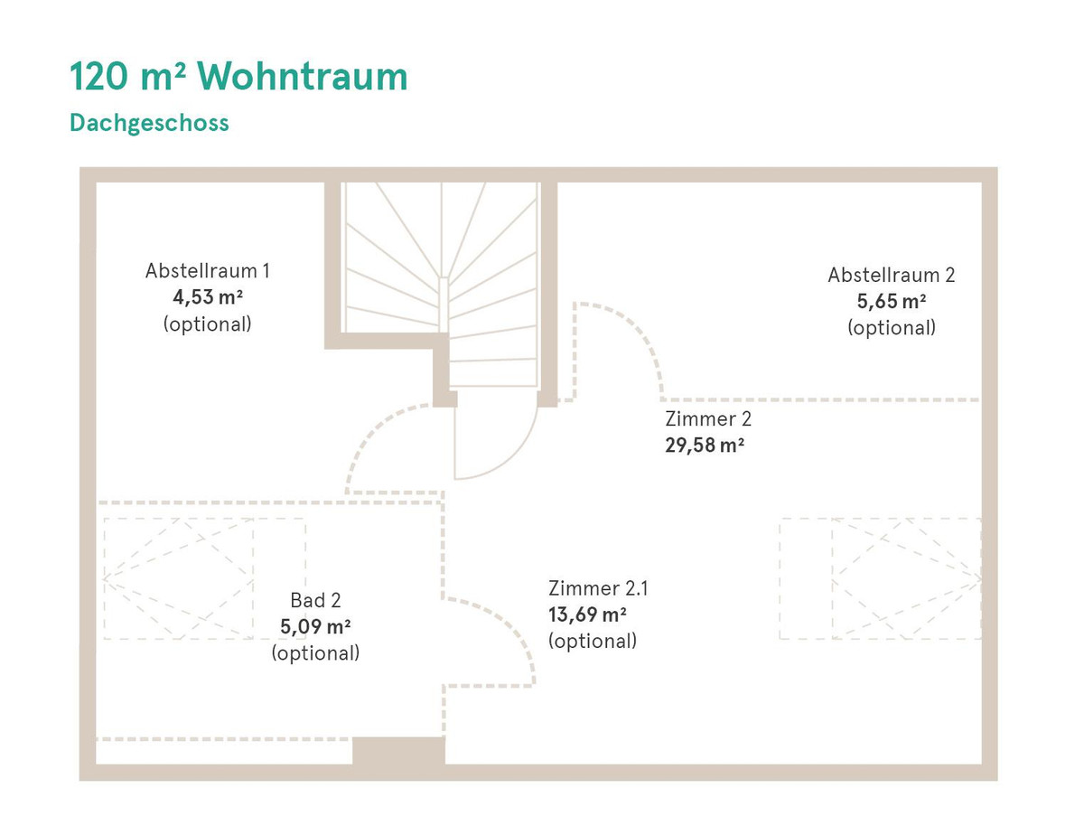 Auch das Dachgeschoss bietet Ihnen unzählige Wege zur persönlichen Ausgestaltung. Ein Eltern-Schlafzimmer, ein weiteres Kinderzimmer, ein Abstellraum oder ein zusätzliches Bad sind hier möglich. Der Spitzboden über dem Dachgeschoss bringt mit 19 m2 zudem viel Platz für allerlei Erinnerungen mit, die sich im Laufe eines Familienlebens ansammeln.
