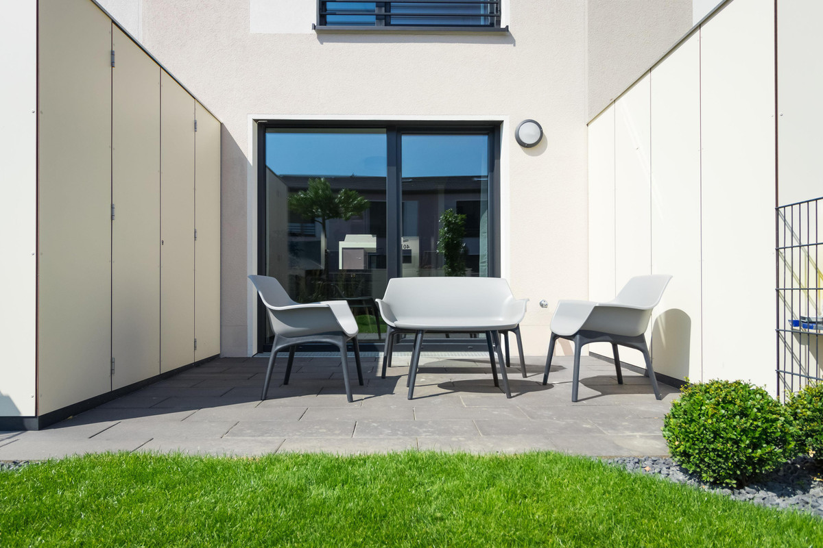 Den Gartenbereich statten wir mit einer gepflasterten Terrasse und einem Terrassenschrank aus, in dem Sie Gartengeräte und Pflanzutensilien verstauen können. Gleichzeitig dient der Schrank auch als Sichtschutz zu Ihren Nachbar:innen. Am Ende des Gartens stellen wir noch eine Gartenbox für Sie auf, in die allerhand rein passt.
