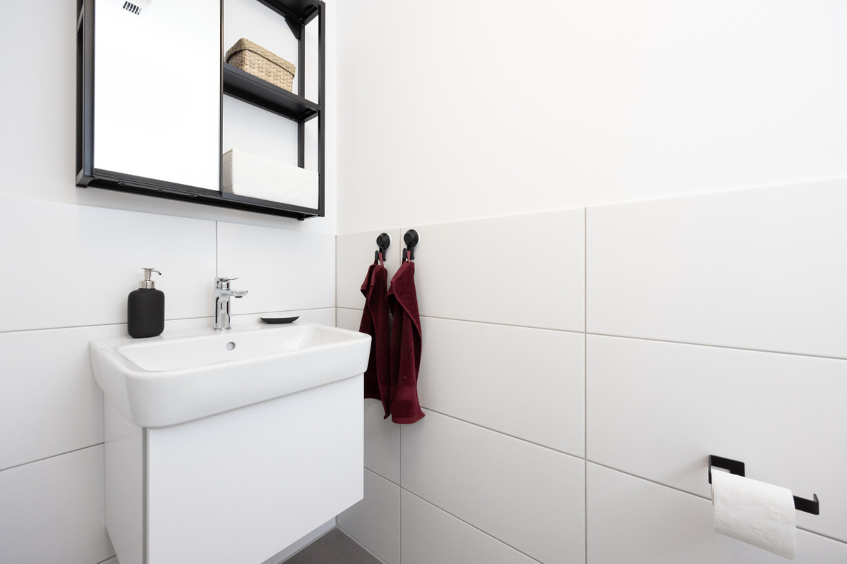 Fangen wir mit dem Bad an, das mit 8 m2 genügend Raum für Waschtisch, WC, Waschmaschine, eine Badewanne und eine Dusche bietet. Natürlich können Sie Ihr Bad so gestalten, wie Sie es sich immer gewünscht haben. Zum Beispiel mit einer großen, begehbaren Regendusche.