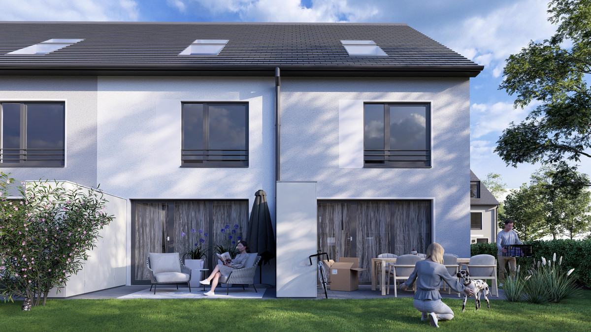 Stellen wir uns vor, Sie fahren mit dem Auto zu Ihrem Haus mit 120 m² bzw. 145 m². Sie biegen ein auf eine begrünte Wohnanlage und parken auf Ihrem eigenen Stellplatz. Sie gehen ein paar Meter an spielenden Kindern vorbei, denn das ist hier unbeschwert möglich, und begrüßen Ihre Nachbar:innen.