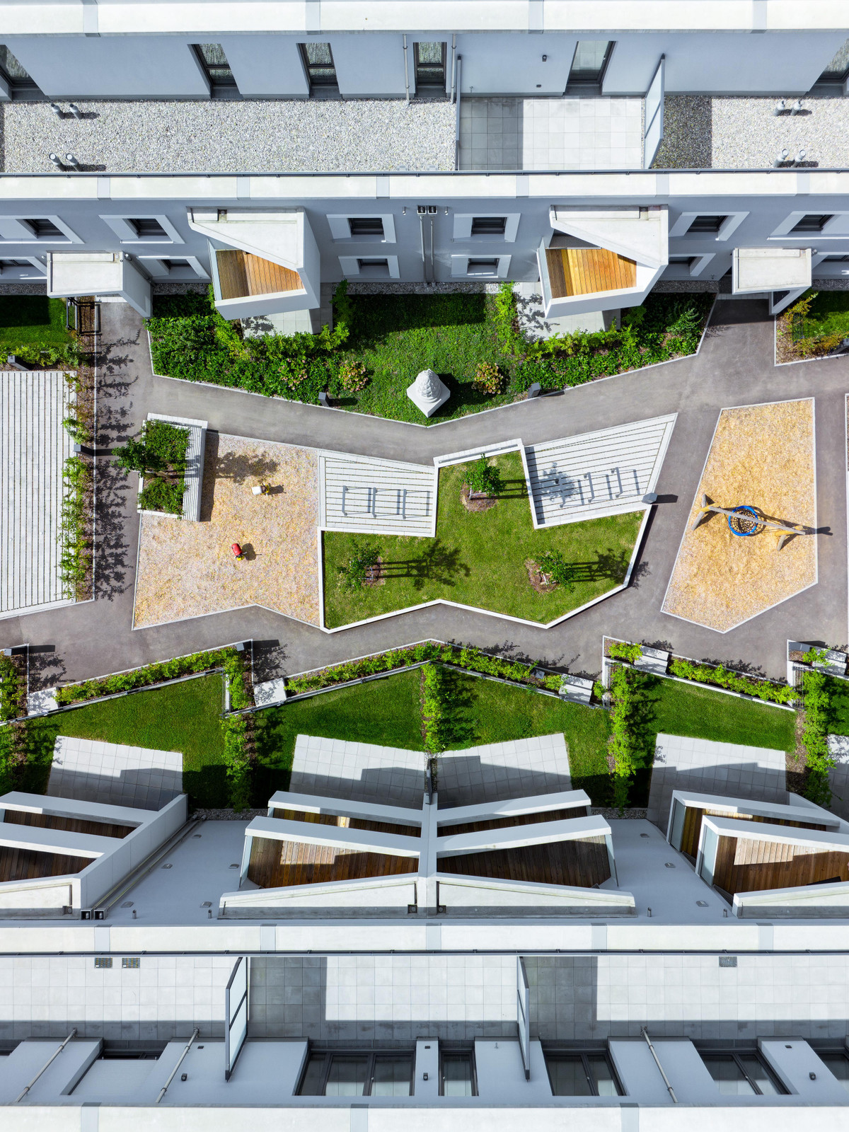 One-sided bevelled reveals at the window openings generate differently shimmering light in the facades depending on the position of the sun. The play of twists and angles is continued in the outdoor facilities through sawtooth-arranged hedges of the private gardens and path bends.